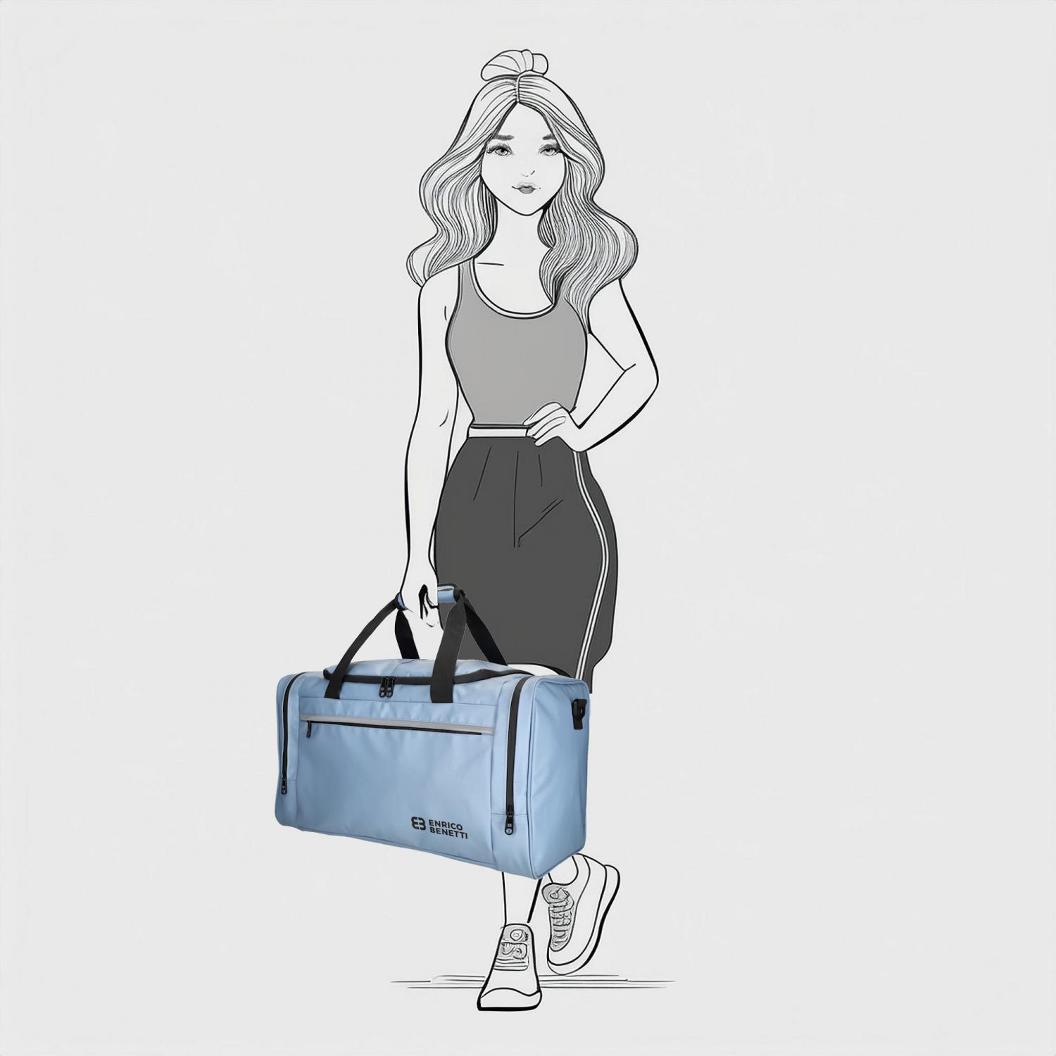 Cestovní taška Enrico Benetti Arctic ve svěží světle modré barvě je ideální volbou pro všechny, kdo hledají spolehlivé, lehké a stylové zavazadlo na cesty i sport. Díky vodoodpudivému materiálu se nemusíte obávat nepříznivého počasí – vaše věci zůstanou v bezpečí i při nečekané přeháňce.