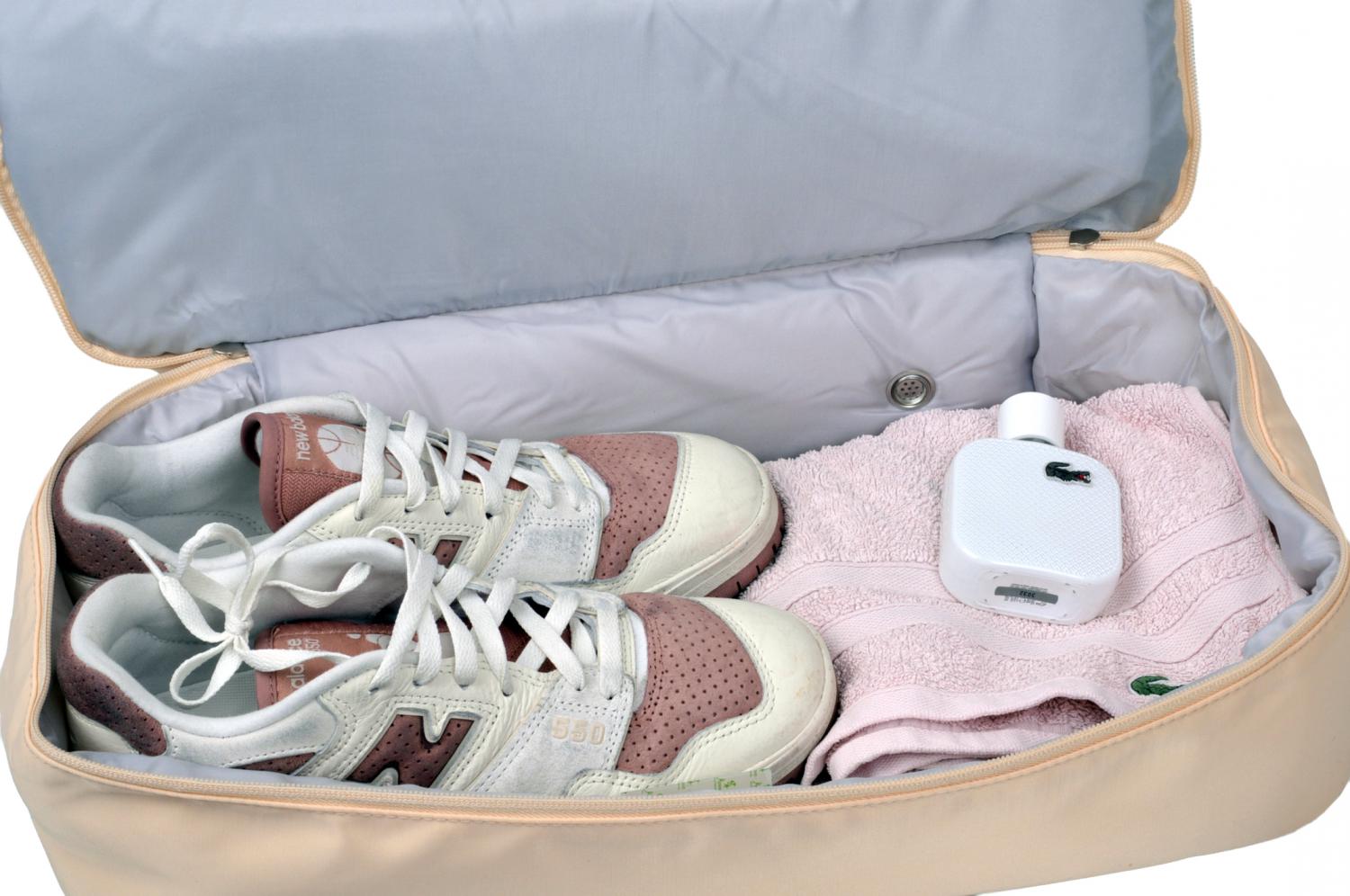 Taška je prakticky rozdělena na dvě samostatné části, což umožňuje přehlednou organizaci obsahu a oddělení čistých a použitých věcí.
