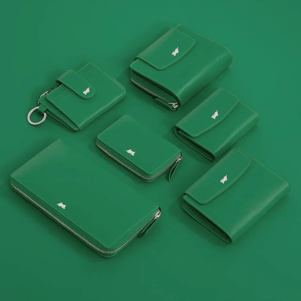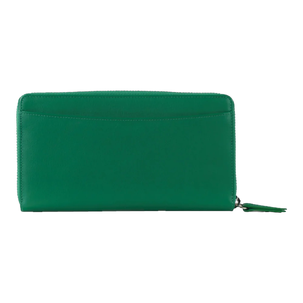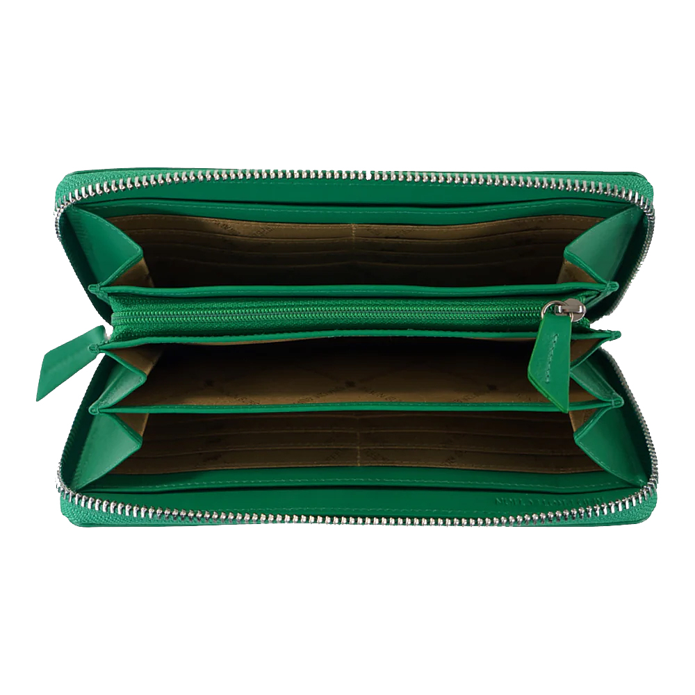Stylová podlouhlá peněženka z měkké hovězí kůže v zelené barvě. 18 slotů na karty, RFID ochrana a moderní design se stříbrnými detaily.