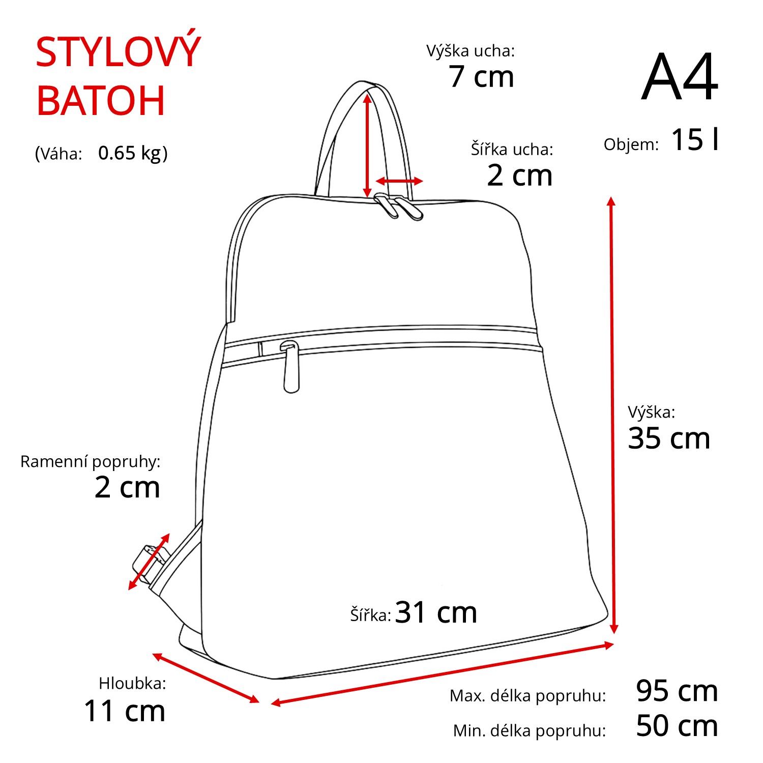 Batoh je vyroben z kvalitní syntetické kůže, která působí luxusně, snadno se udržuje a je odolná při každodenním nošení. Jeho čistý, elegantní design se skvěle hodí do práce, na schůzky, nákupy i odpolední kávu s kamarádkou. Díky promyšlenému střihu působí jemně a žensky, ale zároveň nabízí dostatek prostoru pro všechny vaše nezbytnosti.
