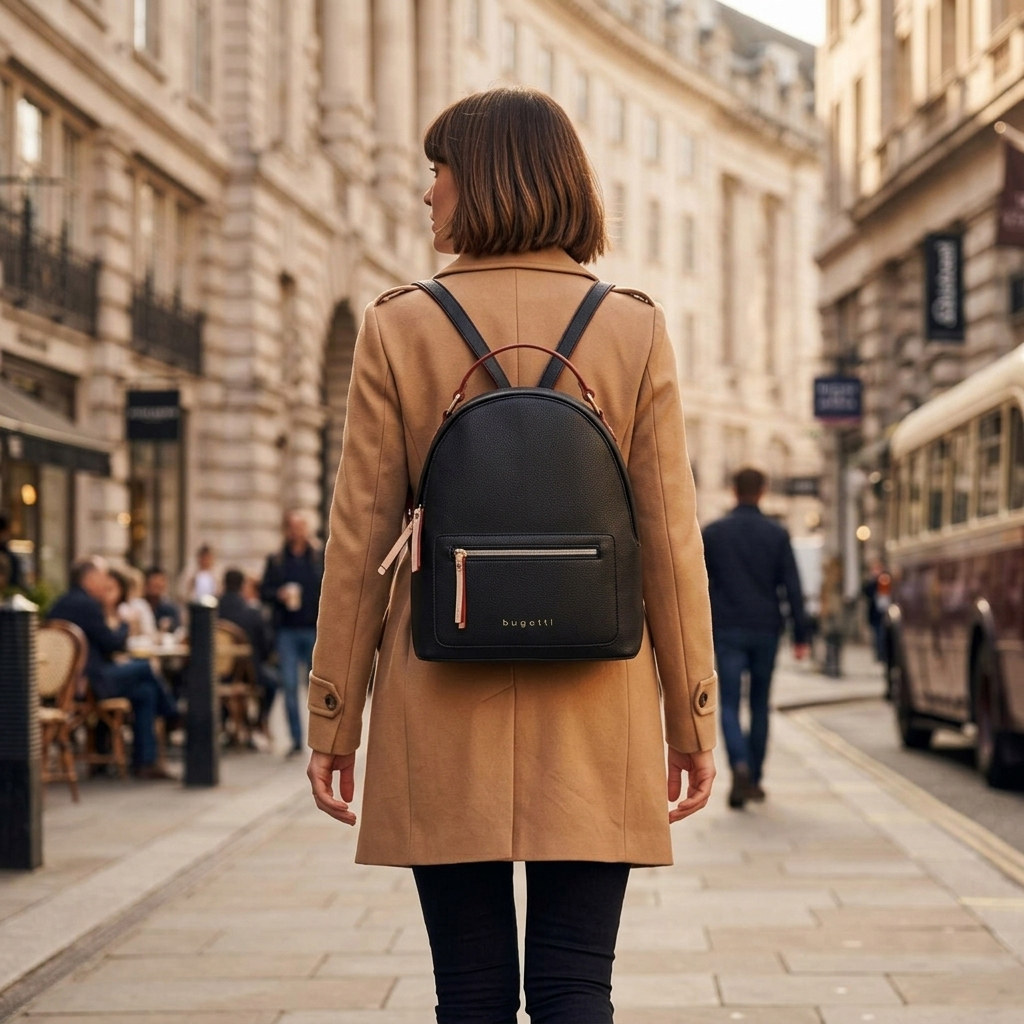 Stylový batůžek pro moderní ženu, která ví, co chce. Tento elegantní model od prémiové značky Bugatti z kolekce Ella v nadčasové černé barvě představuje dokonalou rovnováhu mezi elegancí a praktičností. Je navržen jako spolehlivý společník pro dynamický životní styl – skvěle doplní pracovní outfit, outfit do města i společenské příležitosti.