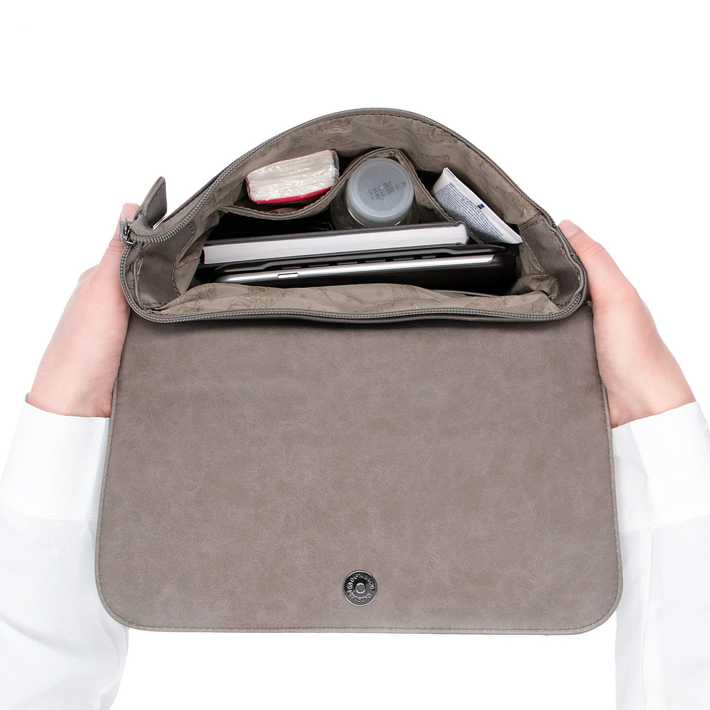 • Uvnitř naleznete jednu menší zipovou kapsu pro uložení peněženky a dvoj kapsu na drobnosti, třeba na mobil a kapesníky.