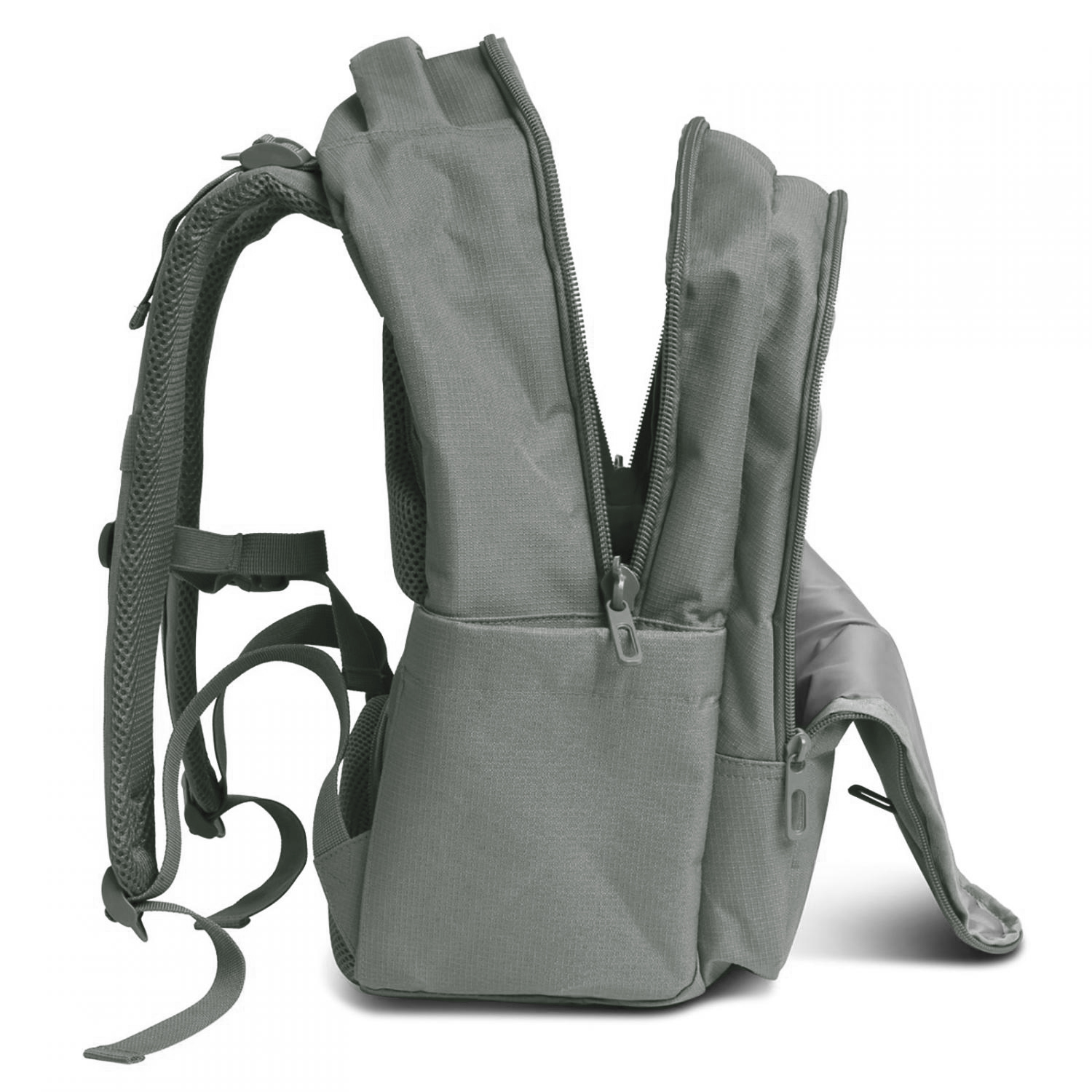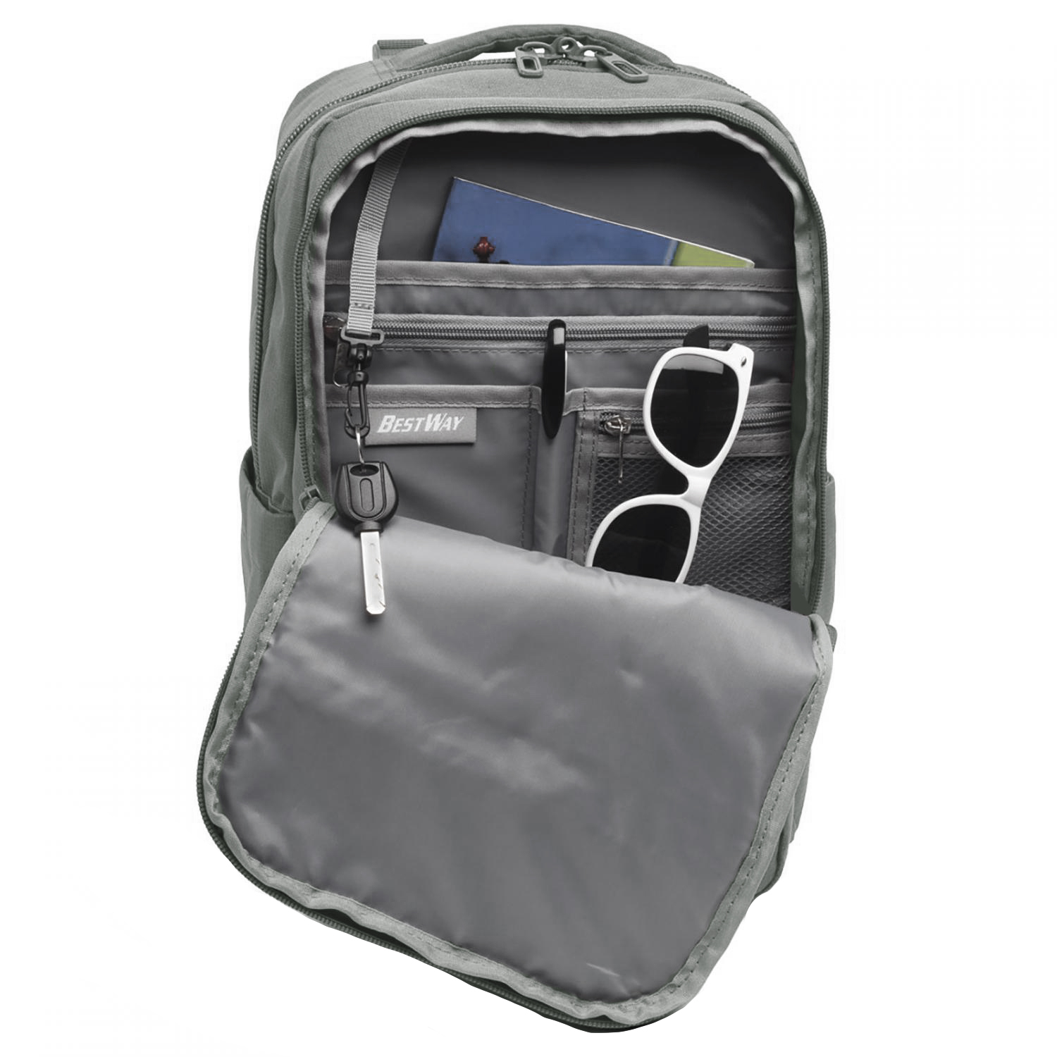 Přední velká kapsa s organizérem, přihrádkou na dokumenty formátu A4, velkou síťovinovou kapsou a karabinkou na klíče