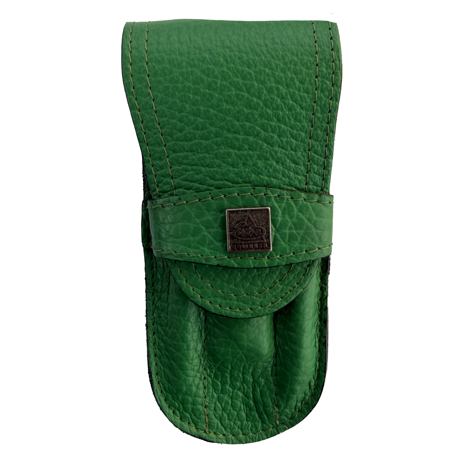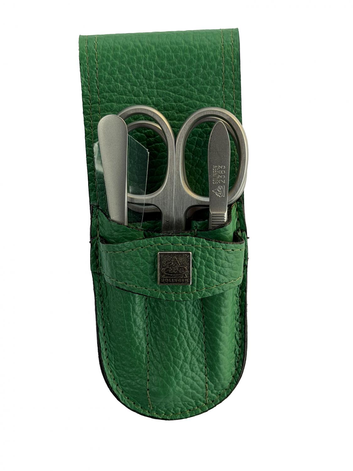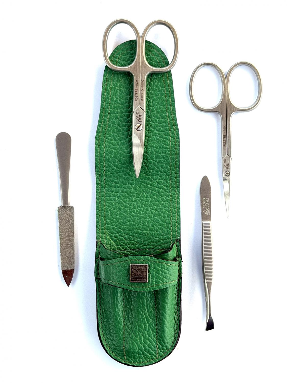 Pouzdro je vyrobeno z pravé hovězí kůže v elegantní zelené barvě, uzavírá se na klopnu a působí luxusně i při každodenním používání. Uvnitř najdete čtyři nástroje z nerezové, speciálně kalené oceli – odolné vůči korozi, s dlouhou životností a trvale ostrými hranami. Díky tomu je sada vhodná i pro skladování ve vlhkém prostředí.