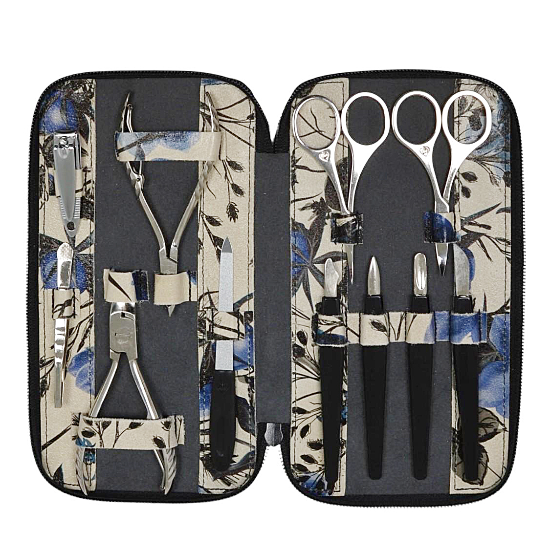 Objevte kouzlo dokonale upravených rukou s touto rodinnou, plně vybavenou 11dílnou manikúrní sadou v luxusním koženém pouzdře s výrazným květinovým motivem. Díky praktickému zapínání na zip máte vše bezpečně uložené a přehledně uspořádané.