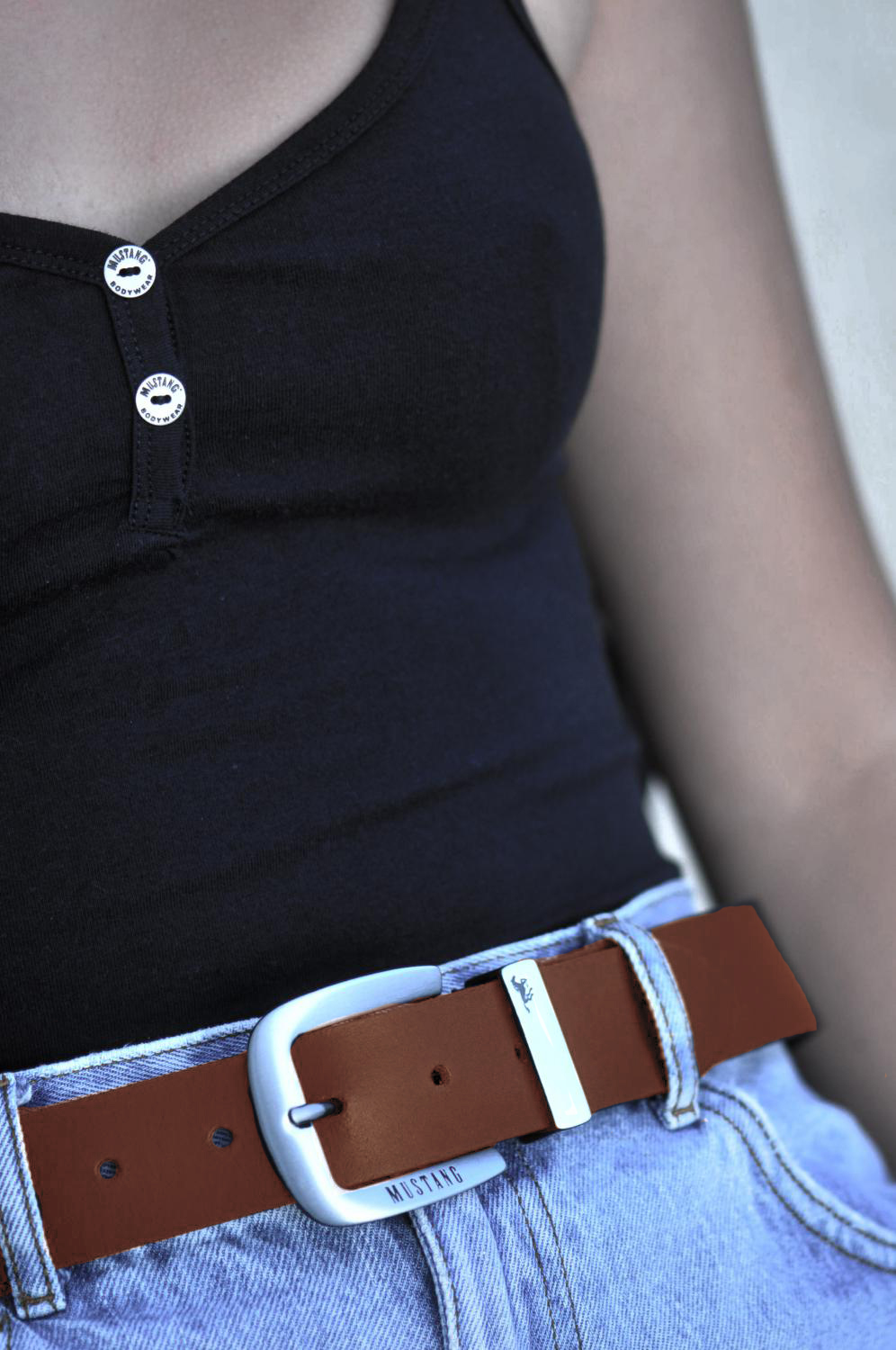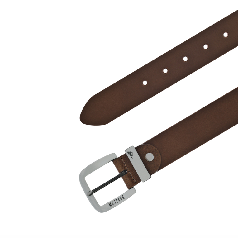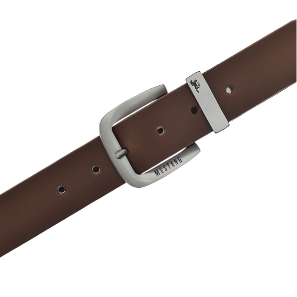 Odolná kůže šířky 3,5 cm a kvalitní přezka zajistí váš komfort v každé situaci. Přeska pásku v robustním provedení s matným povrchem bude dokonalým doplňkem ke každému vašemu outfitu. Logo Mustang na průvleku.