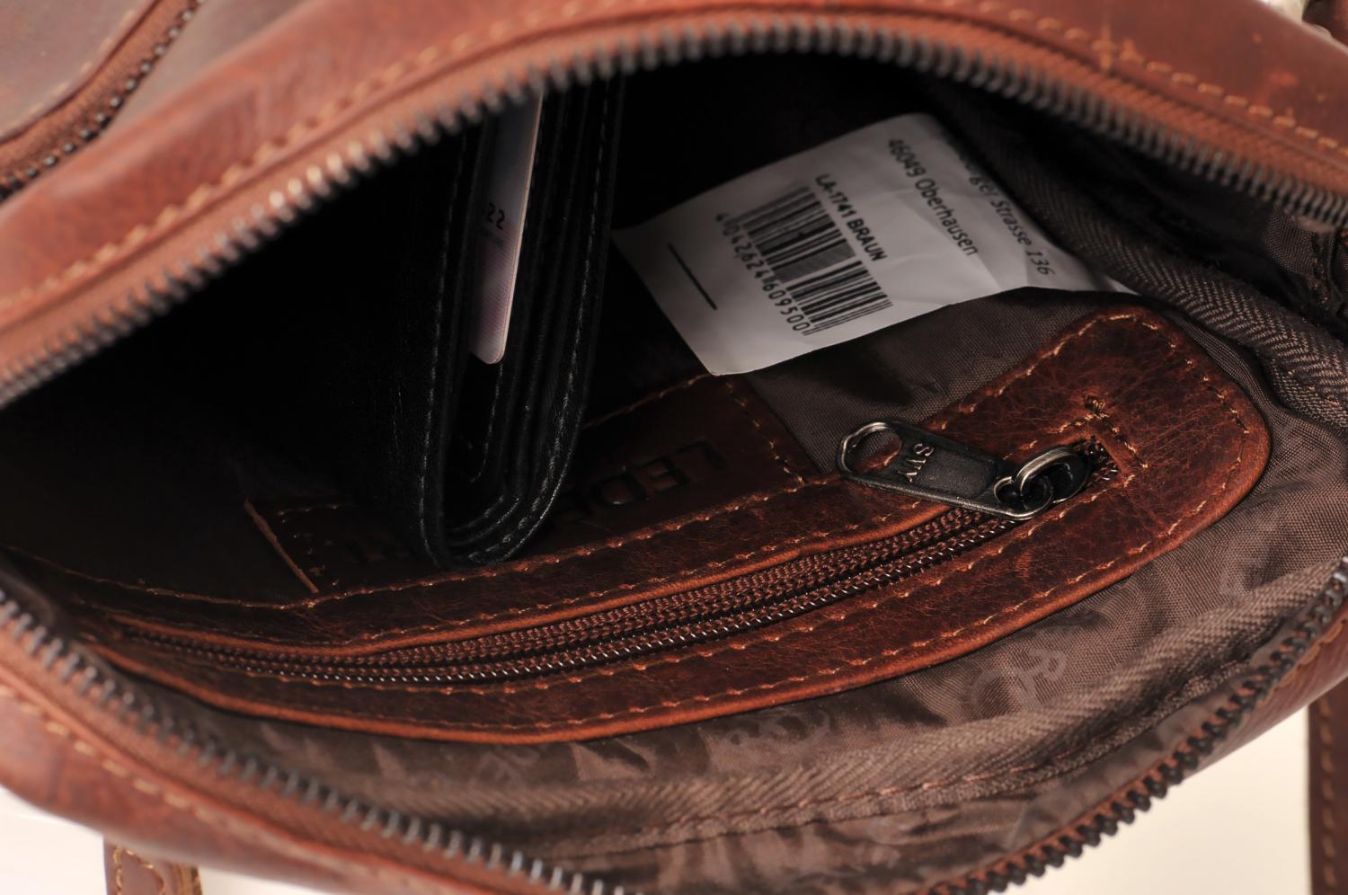 Taška je vybavena hlavní kapsou na zip, dvěma předními zipovými kapsami pro rychlý přístup a vnitřní kapsou na drobnosti. Nastavitelný kožený popruh s kovovou přezkou umožňuje pohodlné nošení přes rameno nebo křížem. Vnitřní podšívka je textilní, s decentním vzorem a logem výrobce.