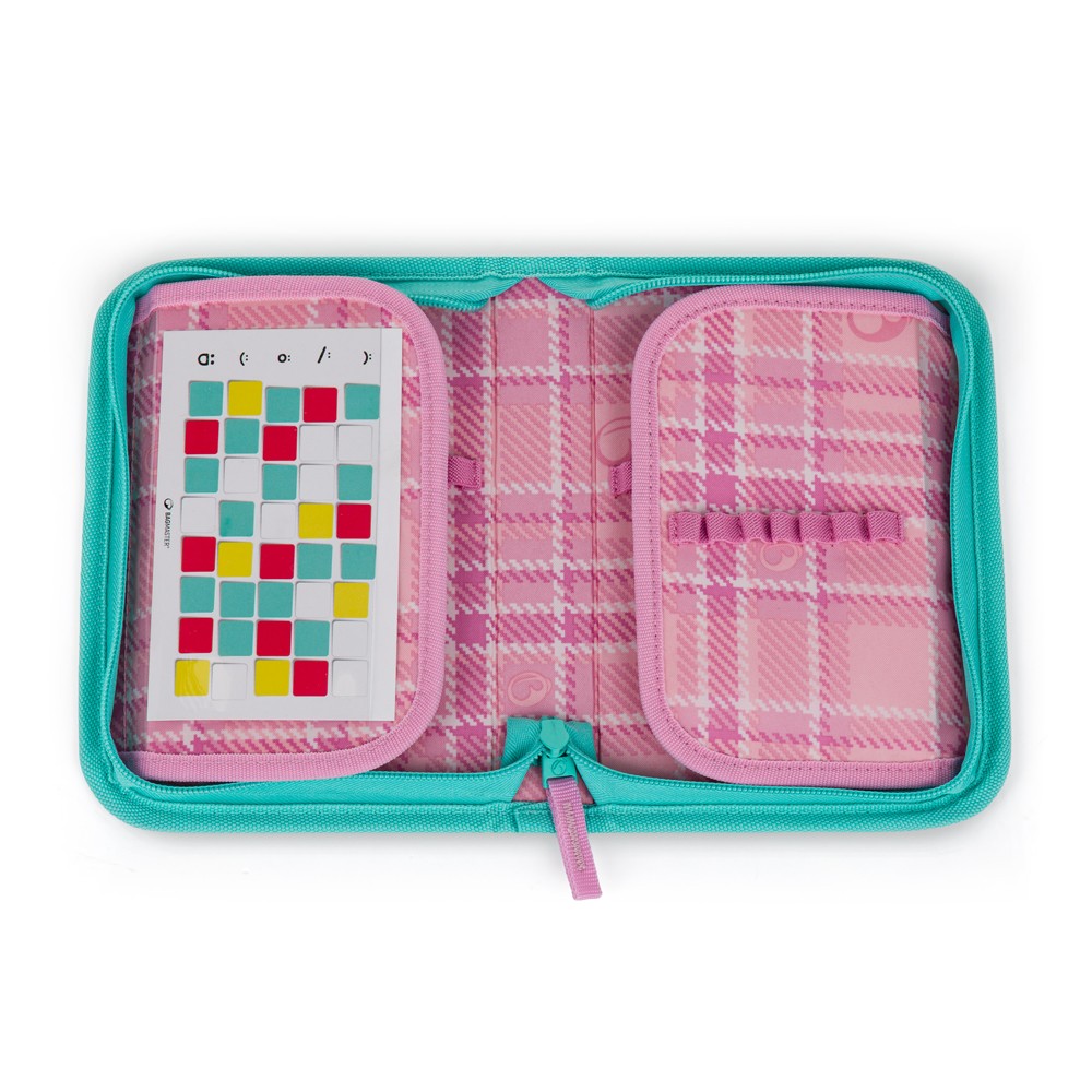 • Na dvou otevíravých chlopních je 35 pružných gumových úchytů na pastelky, pera, fixy, gumu, nůžky, kružítko a další pomůcky.