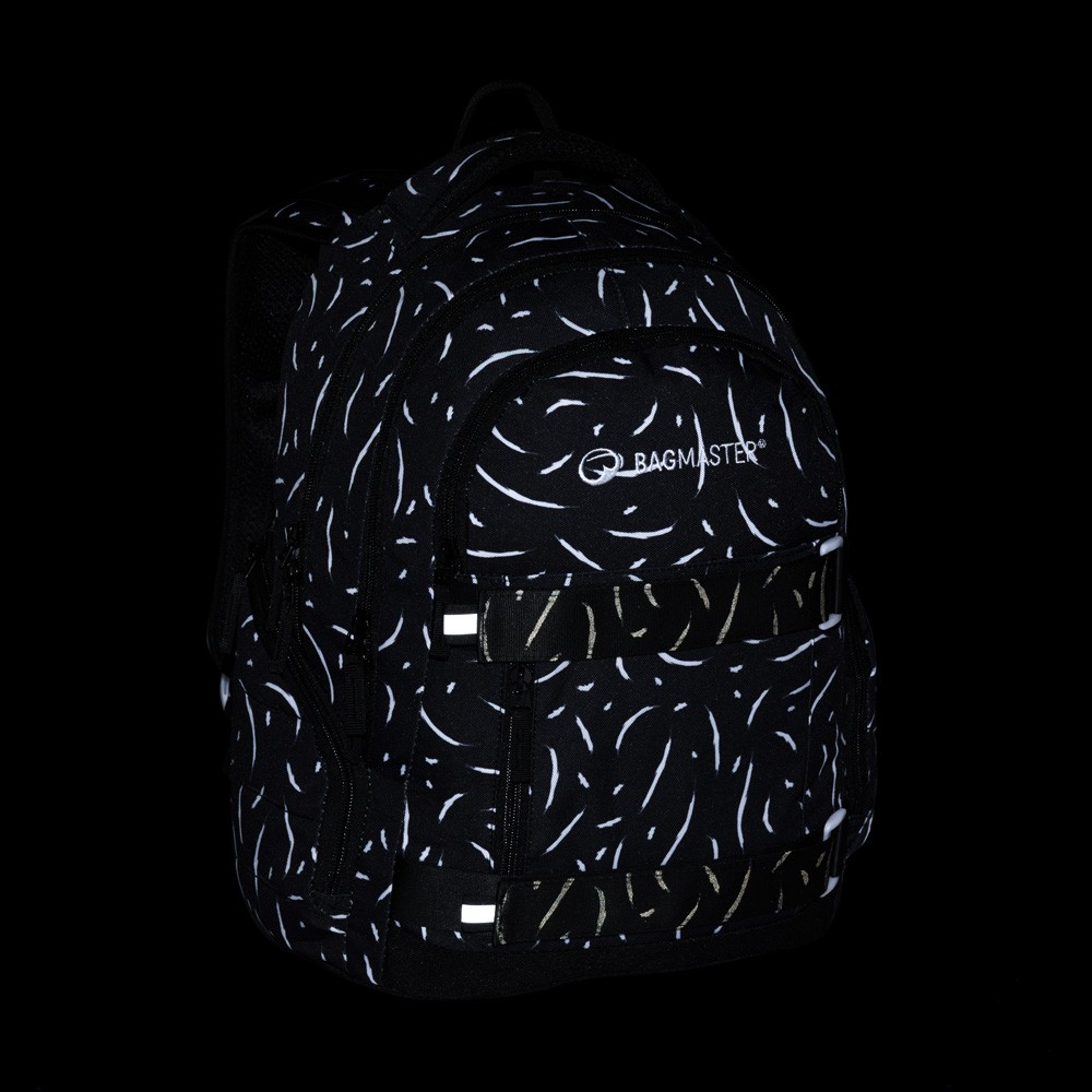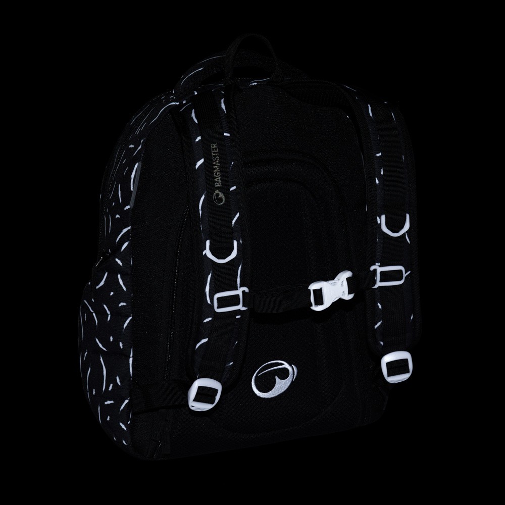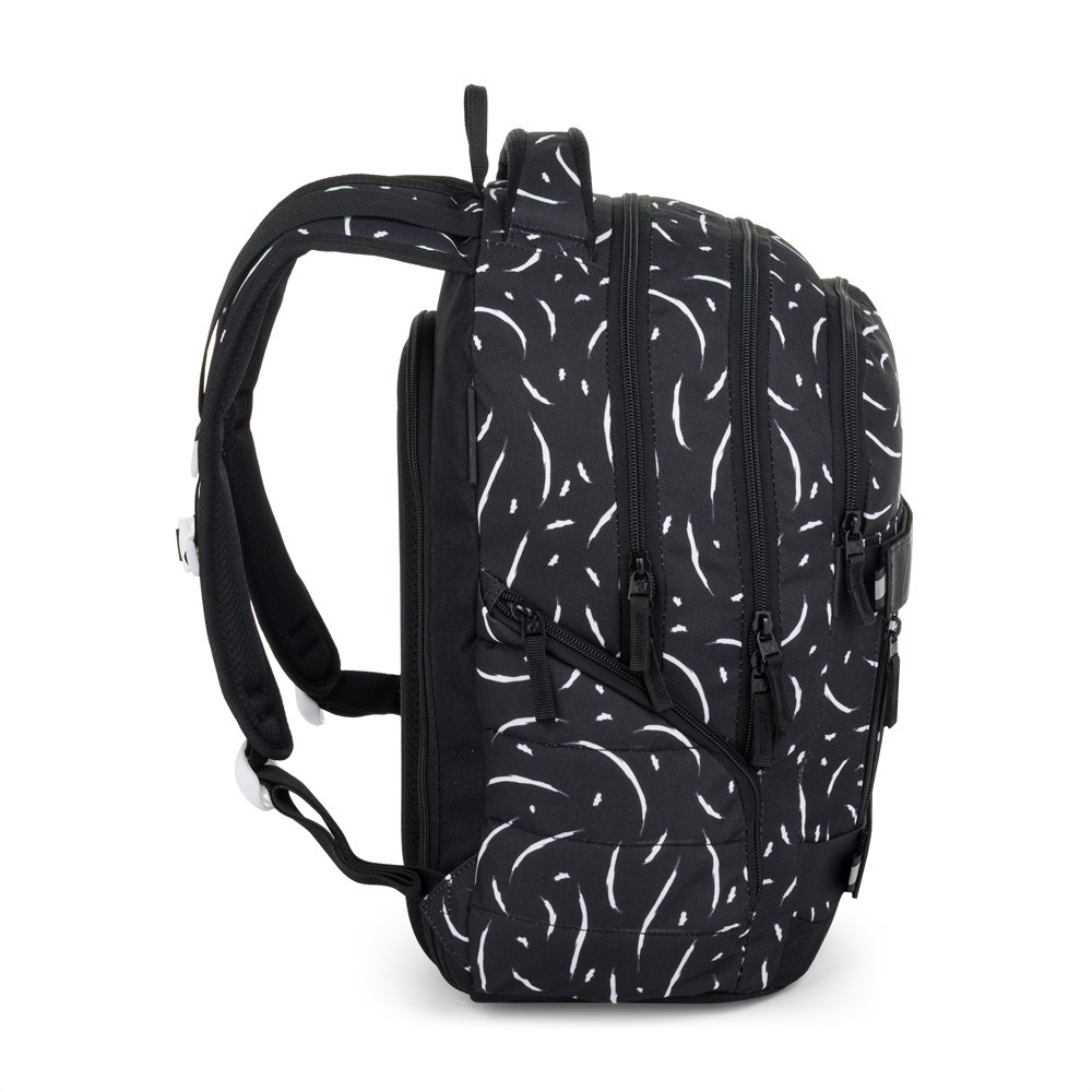 Elegantní černý batoh NOMAD s bílými detaily má dvě komory a přední kapsy, které jsou ideální na sešity, učebnice a drobné cennosti. Díky polstrovaným zádům a hrudnímu pásu se pohodlně nosí. Reflexní prvky a odolné zpracování zajistí, že batoh zůstane spolehlivým společníkem po další školní roky.